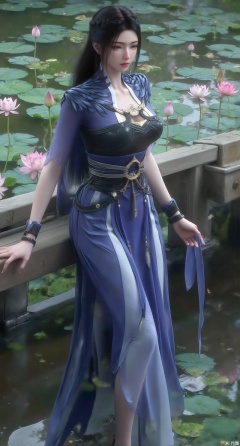 (masterpiece:1.2),best quality,The image is a digital illustration of a young woman sitting on a wooden bench in a pond with lily pads. She is wearing a long dress with design on the chest and sleeves. The dress has a high neckline and short sleeves,Holding a lotus in hand. She has long dark hair styled in loose waves and is wearing gold high heels. The woman is posing with one hand on her hip and the other resting on the edge of the bench. The background is filled with pink and white lotus flowers and green leaves. The overall mood of the image is peaceful and serene,(huge breasts:2.99),(full breasts:2.99),(Background with traditional Chinese architecture,Pond, water lilies:1.39),,XzilingXY3,XlimuwanJCY,XmoxianYK,Xfanlv