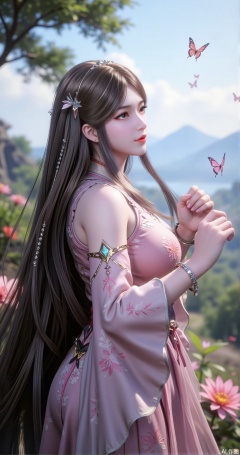 A long-haired woman stands in a dream garden, gazing into the distance, as if playing a silent solo. Her black hair cascades like silk, adorned with exquisite hair ornaments, with a few butterflies dancing among her hair strands, as if attracted by her beauty. She wears a floral-printed Hanfu, embroidered with magnificent floral patterns, the silk fabric shimmering with soft light in the dream.