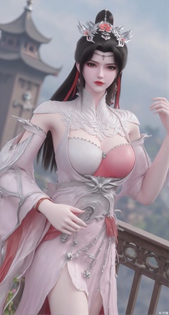 SFW,(masterpiece, top quality, best quality, official art, beautiful and aesthetic:1.2),Realistic,long dress,(Traditional Asian-inspired attire with a vibrant floral accessory and intricate hair ornament),realistic,hanfu photography,hanfu,1girl,fair_skin,glamor,very long hair,absurdres,incredibly absurdres,wallpaper,artbook,chinese_style_loft,turret,tower,handrail,plant,wisteria,spider_lily,face_focus,dynamic_angle,depth of field,looking_at_viewer,(huge breasts:2.99),(full breasts:2.99),(rose,rose sea:1.59),,XzilingXY3,XlimuwanJCY,XmoxianYK,Xfanlv