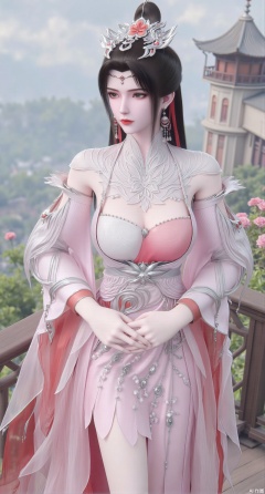 (masterpiece, top quality, best quality, official art, beautiful and aesthetic:1.2),Realistic,long dress,(Traditional Asian-inspired attire with a vibrant floral accessory and intricate hair ornament),realistic,hanfu photography,hanfu,1girl,fair_skin,glamor,very long hair,absurdres,incredibly absurdres,wallpaper,artbook,chinese_style_loft,turret,tower,handrail,plant,wisteria,spider_lily,face_focus,dynamic_angle,depth of field,looking_at_viewer,(huge breasts:2.99),(full breasts:2.99),(rose,rose sea:1.59),XliumeiYK