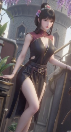 (masterpiece:1.2),best quality,hanfu,(Traditional Asian-inspired attire with a vibrant floral accessory and intricate hair ornament), realistic,hanfu photography, hanfu,1girl,fair_skin,glamor,very long hair,absurdres,incredibly absurdres,wallpaper,artbook,chinese_style_loft,turret,tower,handrail,plant,wisteria,spider_lily,face_focus,dynamic_angle,depth of field,looking_at_viewer,(huge breasts:2.99),(full breasts:2.99),(very long legs,Diamond-studded high heels:1.5),,XliumeiYK