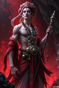 Ultra-clear picture quality, master works, 8k, burgundy hair, eye shadow, black lips, tiger teeth, playful expression, oversized skeleton-shaped Buddhist beads, tattered cassocks, holding a Zen staff in hand, rich details, the background is a dark valley mixed with blood-red mist, studio quality, magical atmosphere,A BOW-Sakyamuni
