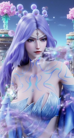 (masterpiece:1.2),best quality,,an anime CG style image.A girl has long purple hair,There is a crown on her head,She has beautiful and delicate facial features, fair skin, and wearing a white dress,sitting Floating islands in celestial valley, bioluminescent flora under starlight, pastel pink and aqua auroras, dreamlike composition with impossible physics, 3D render style.(huge breasts:2.99),(full breasts:2.99),XliumeiYK,XlishaoyingXK