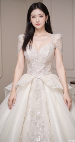 dress, wedding dress, 1girl, white dress, solo, indoors, long dress,1, cover,simple background,gradient background,close-up details,outstanding style,adding a touch of dimension to your images without compromising details,close-up