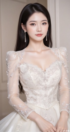 dress, wedding dress, 1girl, white dress, solo, indoors, long dress,1, cover,simple background,gradient background,close-up details,outstanding style,adding a touch of dimension to your images without compromising details,close-up