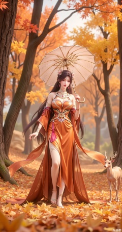 In a forest blanketed in autumn leaves, a lone girl holds a golden lace umbrella, her movements as light as a dream, as if one with the autumn forest. She is dressed in a deep orange gown woven from silk and cotton, adorned with tiny maple leaf patterns, gently swaying with her steps. Her long black hair flows like silk, dotted with falling maple leaves, adding a touch of autumn charm. She wears a necklace of amber and gold leaf, her wrists adorned with slender silver bracelets, exuding dreamlike elegance.