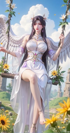 n a mysterious garden floating in the clouds, a long-haired girl is sitting on a swing woven from white lilies and golden sunflowers. Her movements are as light and sacred as those of an angel, as if she has merged with the garden in the clouds. She was dressed in a long pure white dress woven from silk and lace, with tiny angel feathers and cloud patterns embellished on the hem, swaying gently with her movements. Her long black hair is as smooth as silk, with a few falling lily petals dotted between the strands, adding a touch of sacredness. She wore a necklace composed of pearls and angel feathers, with a slender silver bracelet wound around her wrist, looking sacred and noble.