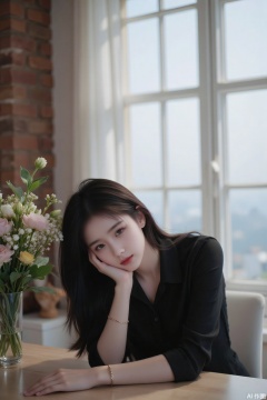 High-quality 8K photos. It was shot in a candid style, focusing on a young Taiwanese woman. She is the central subject of the picture, looking directly into the camera, her head resting on her hands, and wearing a black top. The composition feels intimate yet casual. The background shows a bright window with brick wall details and some interior furniture partially visible. Natural light enhances the soft and relaxing atmosphere. Her expression is calm and peaceful, adding to the sense of personal connection with the viewer. A floral decoration is visible on the left section, adding a touch of color and decoration to the scene.,tsp