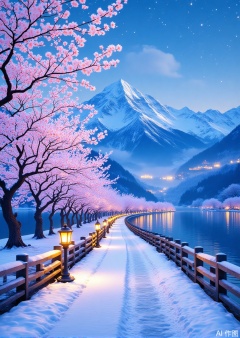 reflecting the stars and the soft glow of the lanterns. The trees are illuminated by the lanterns