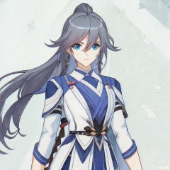 looking at viewer,fu_hua, fu_hua cgver, long hair, bangs,blue eyes, hair between eyes, ponytail,hair ornament, grey hair, blue hair