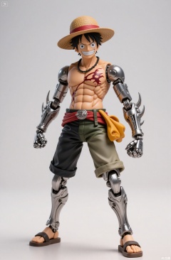 1boy, monkey d. luffy, abs, male focus, straw hat, black hair, hat, smile, scar, belt, sandals, clenched hands, muscular, teeth, looking at viewer, full body, shorts, mechanical arms, topless male, black eyes, solo, open mouth, pectorals