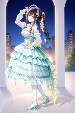 masterpiece,best quality,newest,absurdres,highres,soft shadows,year2024,mutou kurihito,[kimishima ao],[[[bison cangshu]]],[[[[[sheya]]]]],<lora:noaXLNAI:1>,noa,ponytail,black hair,brown eyes,hair ribbon,1girl,solo,smile,mature female,<lora:wishfulaurosaXLNAI:1.4>,wishful aurosa,dress,green dress,see-through sleeves,detached sleeves,strapless dress,dress flower,white thighhighs,print thighhighs,earrings,frilled dress,see-through dress,platform footwear,outdoors,street,cityscape,legs apart,large breasts,hand on own hip,arm up,night,dress tug,full body,from side,