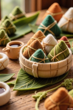 Miniature World Dragon Boat Festival Felt Style,High image quality,Ultra photoreal,Insane Details,32K,Realistic,Miniature World,The picture style is a felt handicraft style that uses the unique soft texture, rich colors, and handmade texture of the felt material to create a warm and rustic atmosphere. The picture adopts an overhead shooting perspective, and the scene is a beautifully decorated wooden tabletop. In the center of the tabletop, there is an antique bamboo basket made of felt, filled with zongzi wrapped in colored felt and wound with silk threads. The zongzi are plump in shape and bright in color, including emerald green, light brown, off - white, etc. Next to the bamboo basket, there are several fresh mugworts and calamus. The leaves of the mugworts and calamus are carefully made of green felt, with clear veins, exuding a faint fragrance. In one corner of the tabletop, there is a small wine pot and wine cup made of felt. The wine pot has a round shape, and the wine cup is delicate and small, as if it has just been filled with realgar wine. The sunlight shines on the tabletop through the window, forming soft light and shadow, highlighting the texture of the felt material and the warm atmosphere of the festival. In terms of composition, the bamboo basket is located in the center of the picture, and elements such as mugworts, calamus, wine pot, and wine cup are distributed around it, making the picture more rich and harmonious.,masterpiece