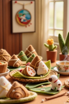 Miniature World Dragon Boat Festival Felt Style,High image quality,Ultra photoreal,Insane Details,32K,Realistic,Miniature World,felt style,The picture style is a felt handicraft style with soft colors, thick texture, and a handmade touch. From a frontal perspective, the scene is a warm - decorated indoor living room. The sunlight gently shines on the ground through the window. On the table in the middle of the living room, there is a felt - style fruit plate in the shape of a bamboo - woven basket, with peeled and unpeeled felt zongzi neatly placed inside. The peeled zongzi reveals white glutinous rice and rosy sweet dates. Next to it is a cup of steaming felt tea, and the fragrance of the tea seems to be overflowing from the picture. On the wall hangs a felt - made dragon - boat racing picture, with bright colors and the figures on the dragon boat looking vivid. On the ground, there is an adorable felt puppy, curiously staring at the zongzi on the table. The overall picture is dominated by warm colors, creating a warm and peaceful Dragon Boat Festival atmosphere. In terms of composition, the table is in the center of the picture, and the surrounding items and decorations are distributed around the table, enhancing the sense of layering in the picture.