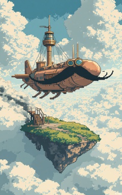 A retro-futuristic airship with copper-and-brass pixel textures, floating above a cloudscape made of swirling white-and-gray blocks. The scene includes a goggled inventor character (mustache as a thick black pixel line) and a gear-shaped island with a winding staircase.