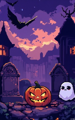A spooky pixel graveyard with a jack-o’-lantern (orange blocks with triangular eyes) and a flying bat (black silhouette against a purple-gradient sky). The ground uses tile-based dirt textures, and a ghost character (white blob with black eyes) hovers near a tombstone.