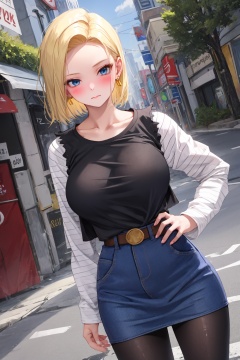 1girl,android 18,breasts,skirt,solo,outdoors,blonde hair,denim,blue eyes,large breasts,pantyhose,looking at viewer,long sleeves,jewelry,shirt,day,earrings,denim skirt,blush,collarbone,short hair,black shirt,road,street,denim jacket,striped shirt,black pantyhose,striped,bangs,closed mouth,parted bangs,open clothes,cowboy shot,forehead,blue skirt,jacket,standing,high-waist skirt,vest,dutch angle,striped sleeves,taut clothes,building,shirt tucked in,taut shirt,<lora:android18-lora-nochekaiser:1>,<lora:android_18_v110:0.4>,