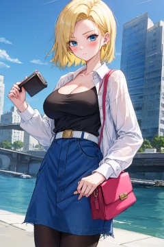 1girl,android 18,breasts,skirt,blonde hair,solo,blue eyes,outdoors,pantyhose,denim,earrings,short hair,jewelry,looking at viewer,long sleeves,belt,collarbone,shirt,day,black shirt,denim skirt,closed mouth,cleavage,building,black pantyhose,sky,blue sky,large breasts,blue skirt,bangs,bag,shirt tucked in,high-waist skirt,blush,holding,medium breasts,cityscape,holding bag,water,brown belt,cowboy shot,city,standing,<lora:android18-lora-nochekaiser:1>,