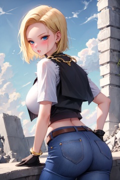 <lora:android18-lora-nochekaiser:1>,<lora:android_18_v110:0.4>,1girl,android 18,solo,blonde hair,blue eyes,jewelry,pants,ass,breasts,short hair,looking at viewer,earrings,denim,crop top,large breasts,parted lips,jeans,gloves,black gloves,belt,looking back,outdoors,shirt,bracelet,fingerless gloves,from behind,ruins,short sleeves,bangs,blush,white shirt,day,forehead,high-waist pants,midriff,necklace,blue pants,thighs,vest,rubble,