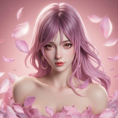 ylj-hd,1 girl,earrings,eyelashes,a charming face,glowing lips,clavicle,shoulder exposure,floating petals,dreamy and beautiful,medium breasts,cleavge,(upper_body:1.6),(masterpiece, top quality, best quality, official art, beautiful and aesthetic:1.2),
