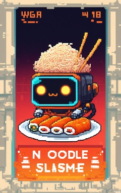 XSFG, A neon-drenched scene with a glowing pink-and-cyan robot holding a sushi platter. The background features glitching holographic signs ("NOODLE BAR") and floating pixelated sushi (orange-red salmon slices with gradient shading).