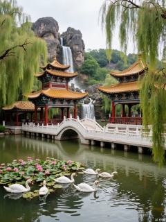 In the ancient Chinese royal garden, the white marble bridge spans an artificial lake, connecting the pavilion in the middle of the lake with the shore. The pavilions and towers are covered with golden glazed tiles, and carved beams and painted pillars. The weeping willows swaying by the lake, the water lilies bloom in the lake, and a group of swans cruising. The rockery is towering in the distance, and the waterfall pours down from the top of the mountain.