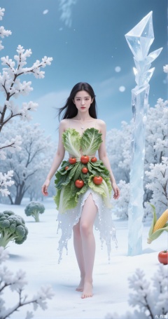 giving it a frosty appearance. Surrounding her is a winter wonderland