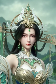 Accessories and Decorations: Wears a magnificent gold - ornamented headdress inlaid with green gemstones and white feather - like decorations. Paired with earrings of the same color system, connected by metal chains and round gemstones, adding a sense of agility. There is a high - collar metal decoration on the neck, echoing the patterns on the clothing.