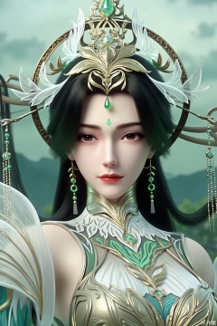 Accessories and Decorations: Wears a magnificent gold - ornamented headdress inlaid with green gemstones and white feather - like decorations. Paired with earrings of the same color system, connected by metal chains and round gemstones, adding a sense of agility. There is a high - collar metal decoration on the neck, echoing the patterns on the clothing.