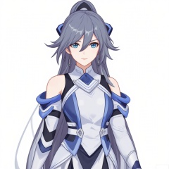 looking at viewer,fu_hua, fu_hua cgver, long hair, bangs,blue eyes, hair between eyes, ponytail, hair ornament, grey hair, blue hair,smile, earrings