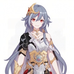 looking at viewer,senti,fu_hua,long hair,smile, bangs,hair ornament,red eyes,hair between eyes,ponytail,silver hair,white hair,gray hair,multicolored hair,small breasts,streaked hair,yellow pupils,diamond shaped pupils