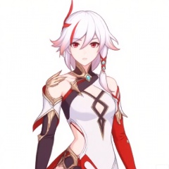 looking at viewer, fu hua, fu hua cgver, long hair, bangs,hair ornament,red eyes,hair between eyes,white hair, multicolored hair,streaked hair, smile, small breasts,red hair, pink hair,low-tied long hair