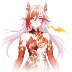 looking at viewer,fu hua bengluo,fu hua,messy hair,jewelry,twintails,eyelashes,facial mark,head wings,two-tone hair,twintails,tattoo,ribbon,bangs,white hair,orange eyes,streaked hair,orange hair,fiery hair,hair between eyes,multicolored hair,hair ornament,hair ribbon,pattern on hair,yellow pupils,diamond shaped pupils