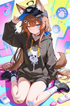 anon,crisp,ezu,Tender,gwwj,1girl, heterochromia, animal ears, blue eyes, hat, solo, long hair, tail, bandaid, brown hair, bandaid on leg, sitting, hood, black headwear, shoes, yellow eyes, blush, dog ears, hoodie, hair ornament, animal ear fluff, white socks, baseball cap, socks, wariza, no pants, ahoge, black footwear, thighs, jacket, bandaid on knee, choker, looking at viewer, full body, long sleeves, dog tail, hand on headwear, hairclip, dog girl, hood down