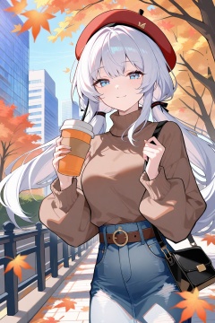 anon,crisp,ezu,Tender,gwwj,1girl, solo, outdoors, skirt, blue eyes, long hair, denim, autumn leaves, sweater, hat, belt, bag, holding, twintails, looking at viewer, cup, long sleeves, smile, leaf, beret, disposable cup, holding cup, building, turtleneck, red headwear, low twintails, white hair, brown sweater, denim skirt, blue skirt, day, closed mouth, autumn, sky, breasts, tree, handbag, turtleneck sweater
