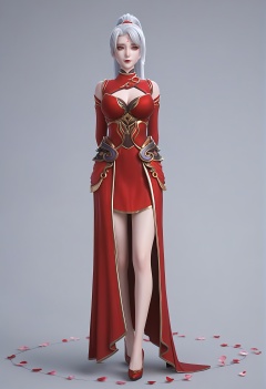(score_9),light blush,body blush,mature,(mature_female:1.1),<lora:焰羽女神-Apony:0.83>,yanyu,solo,1girl,white hair,long hair,ponytail,hair rings,forehead mark,red eyes,red dress,high collar,detached sleeves,bare legs,((arms_behind_back)),looking at viewer,front view,standing,high heels,glamor,branch,twig,falling petals,grey background,OverallDetail,fair_skin,(white_skin),(Ivory_skin),<lora:e色温:0.5>,<lora:e肤色滑块:0.5>,<lora:detailed_notrigger:1>,<lora:perfect-eyes:0.8>,<lora:a修手:0.35>,