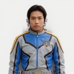 looking at viewer,XIG,helmet,collar,belt,logo,uniform,jacket,pants,gloves,boots,emblem,blue jacket,blue pants,blue jacket with grey line,blue pants with gray line