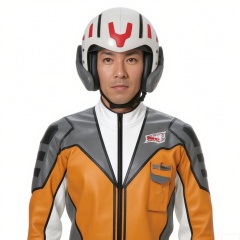 looking at viewer,GUYS,helmet,collar,belt,logo,uniform,jacket,pants,gloves,boots,emblem,orange jacket,grey pants,orange jacket with grey and white line,orange jacket with white collar,grey pants with white line