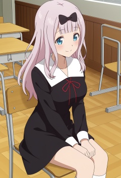 <lora:Chika FUJIWARA_illustrious-000012:1>,Chika FUJIWARA, solo, bow, black bow, sitting, school uniform, chair, smile, dress, black dress, breasts, red ribbon, desk, indoors, socks, long sleeves, ribbon, on chair, white socks, closed mouth, blush, school desk, collared dress, neck ribbon, kneehighs, medium breasts, school chair, anime screencap
