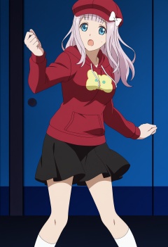 <lora:Chika FUJIWARA_illustrious-000012:1>,Chika FUJIWARA, solo, skirt, hat, hoodie, hood, red headwear, open mouth, black skirt, bow, socks, anime coloring, anime screencap