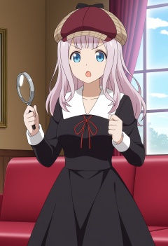 <lora:Chika FUJIWARA_illustrious-000012:1>,Chika FUJIWARA, solo, school uniform, hat, black bow, dress, red ribbon, bow, indoors, black dress, holding, magnifying glass, window, ribbon, breasts, curtains, long sleeves, open mouth, collarbone, couch, neck ribbon, cabbie hat, red headwear, detective, striped headwear, :o, collared dress, v-shaped eyebrows, anime screencap