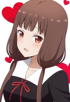 <lora:Iino Miko_illustrious-000010:1>,Iino Miko,1girl,solo,school uniform,heart,blush,open mouth,long sleeves,looking at viewer,red ribbon,dress,upper body,black dress,ribbon,collarbone,white background,neck ribbon,anime screencap,