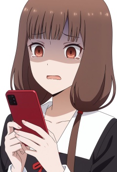<lora:Iino Miko_illustrious-000010:1>,Iino Miko,solo,phone,school uniform,holding,holding phone,cellphone,smartphone,shaded face,tears,dress,upper body,black dress,white background,open mouth,anime screencap,