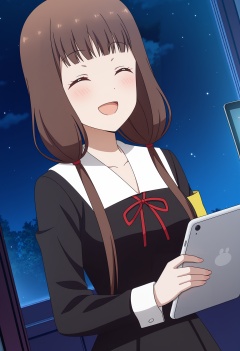 <lora:Iino Miko_illustrious-000010:1>,Iino Miko,1girl,solo,school uniform,closed eyes,smile,open mouth,dress,red ribbon,blush,black dress,long sleeves,holding,ribbon,armband,:d,neck ribbon,night,upper body,tablet pc,collarbone,^_^,collared dress,anime screencap,
