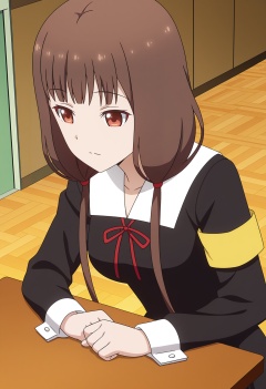 <lora:Iino Miko_illustrious-000010:1>,Iino Miko,1girl,solo,school uniform,red ribbon,armband,long sleeves,closed mouth,ribbon,dress,black dress,upper body,table,anime screencap,