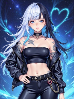 ,1girl, breasts, solo, piercing, heart, pants, long hair, navel piercing, tattoo, jacket, blue hair, choker, jewelry, navel, multicolored hair, looking at viewer, earrings, freckles, black pants, midriff, black jacket, leather pants, large breasts, cleavage, ear piercing, off shoulder, leather, white hair, crop top, open jacket, makeup, two-tone hair, belt, heart choker, black choker, parted lips, mole, heart tattoo, cowboy shot, eyeshadow, open clothes, denim, lips, as7034An illustrated female character with an edgy and futuristic style. She has blue hair, is wearing a leather outfit, and is adorned with tattoos. Her pose is neutral with one hand on her hip. The background features a vibrant blue nebula or galaxy effect, enhancing the cosmic ambiance of the image.