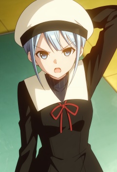 <lora:Ryuuju Momo_illustrious-000028:1>,1girl,Ryuuju Momo,red ribbon,hat,open mouth,white headwear,v-shaped eyebrows,neck ribbon,school uniform,ribbon,arm behind head,solo,upper body,black dress,dress,long sleeves,looking at viewer,blurry,turtleneck,sailor collar,arm up,anime screencap,