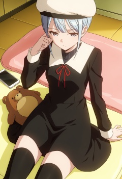<lora:Ryuuju Momo_illustrious-000028:1>,1girl,Ryuuju Momo,hat,thighhighs,red ribbon,dress,black dress,phone,sitting,solo,long sleeves,black thighhighs,neck ribbon,cellphone,school uniform,ribbon,stuffed toy,stuffed animal,white headwear,closed mouth,hand up,smartphone,teddy bear,arm support,collared dress,beret,anime screencap,