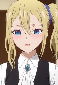 <lora:Ai HAYASAKA_illustrious-000018:1>,1girl,solo,Ai HAYASAKA,side ponytail,blush,open mouth,shirt,white shirt,collared shirt,blurry,blurry background,ascot,sidelocks,white ascot,sweat,jewelry,scrunchie,hair scrunchie,black vest,brooch,anime screencap,