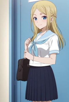 <lora:Ai HAYASAKA_illustrious-000018:1>,1girl,solo,Ai HAYASAKA,solo,school uniform,skirt,braid,smile,bag,serafuku,looking at viewer,sailor collar,pleated skirt,white shirt,shirt,short sleeves,blue sailor collar,closed mouth,blush,blue skirt,standing,bracelet,black skirt,parted bangs,anime screencap,